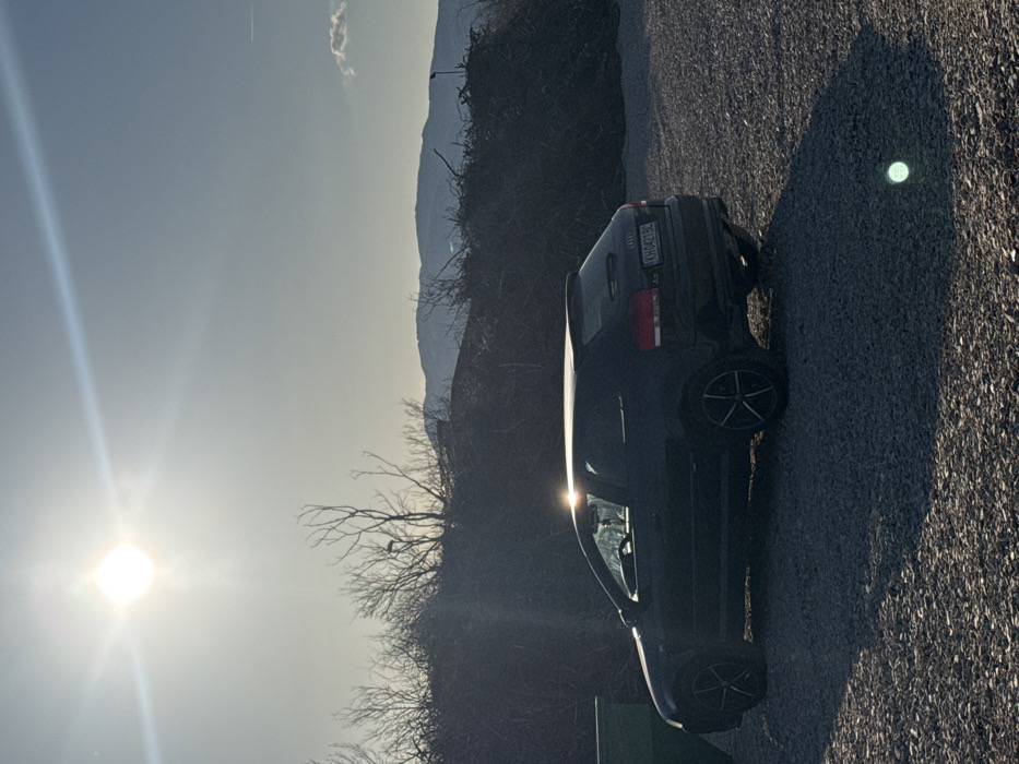 The image depicts an outdoor scene in Nikolichevtsi, Bulgaria, under bright sunlight, indicative of either morning or late afternoon, with long shadows cast across the foreground. A dark-colored two-door Audi A3 hatchback, equipped with black multi-spoke wheels, is parked on a gravel surface, facing slightly away from the viewer. The Bulgarian license plate "KH0421BC" is affixed to the rear of the vehicle. The driver's side window is open or partially lowered. To the immediate left of the car, a large green industrial bin or dumpster is partially visible. In the mid-ground, behind the vehicle, are extensive, dark piles of bare tree branches and brush. The background reveals the silhouetted profile of distant mountains or hills against a clear sky, where a prominent sun causes significant lens flare. A faint contrail from an aircraft is discernible in the upper right quadrant of the sky, along with a small, isolated cloud. No individuals are present in the scene.