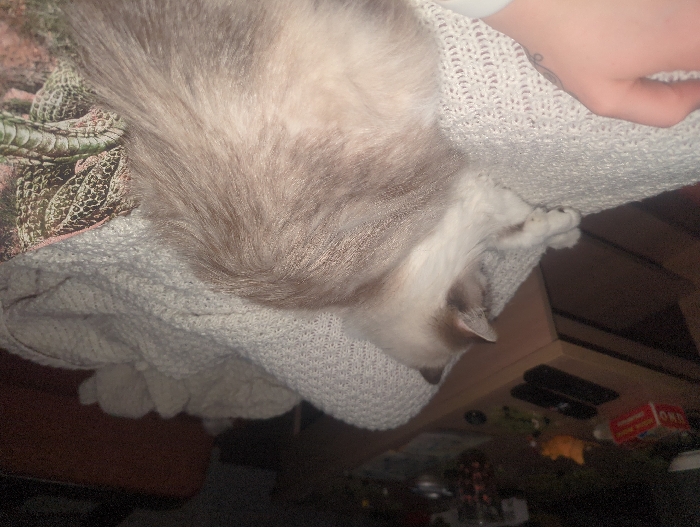 - "An indoor scene in Rostov-on-Don, Russia, depicts a bi-color domestic cat with light cream and grey-brown fur resting on a light-colored, knitted blanket" by FM-fHMy02, licensed under CC BY 4.0