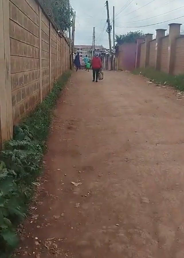 The camera points down a dirt path. The path is bordered by a brick wall on the left and a fence with pillars on the right. Some weeds and grass grow along the borders. At the far end of the path, several people are walking away from the camera. They are wearing various colored clothing. A building is visible in the distance. Overhead, several power lines run along the path. The sky is overcast.