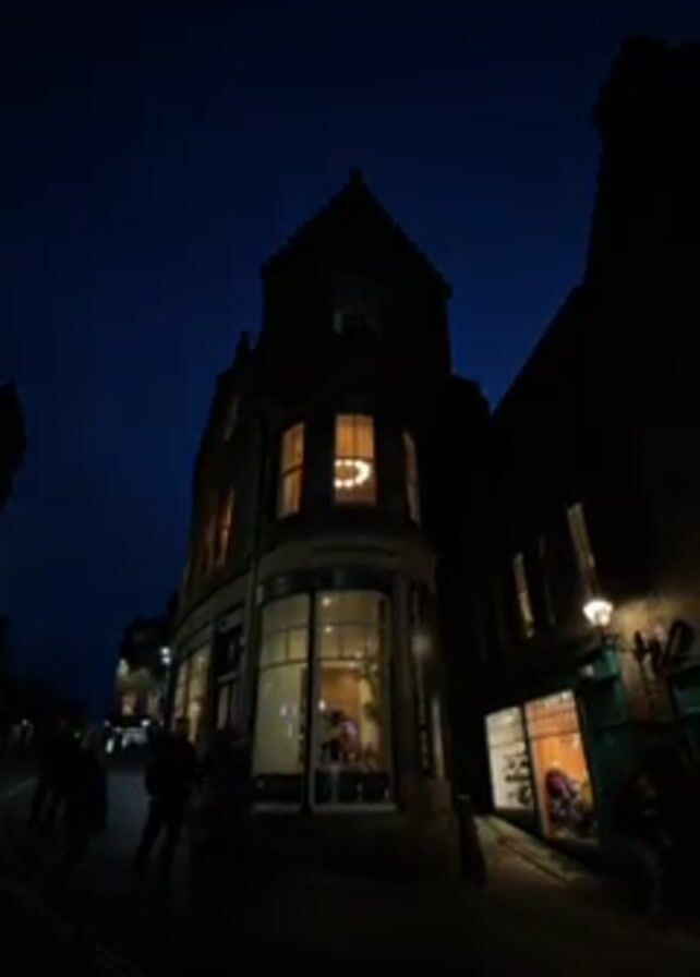 At night, a corner building stands illuminated against a dark blue sky. Pedestrians walk along the street in front of the building. A shop next door also shows light from its window. The building is The Milkman café. The scene suggests a quiet evening in a city.