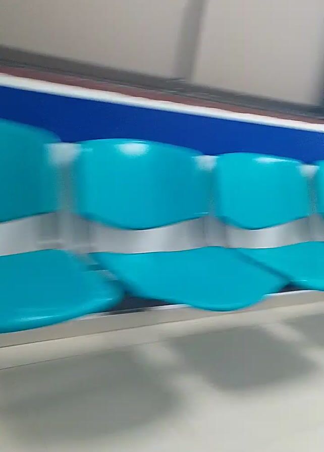 row of light-blue, plastic chairs fixed to a white wall with a blue stripe. The chairs appear to be in a waiting area. A person wearing white shoes and blue pants walks by. The camera angle is low, suggesting it is being held near the ground. The lighting is bright, and the scene appears clean.