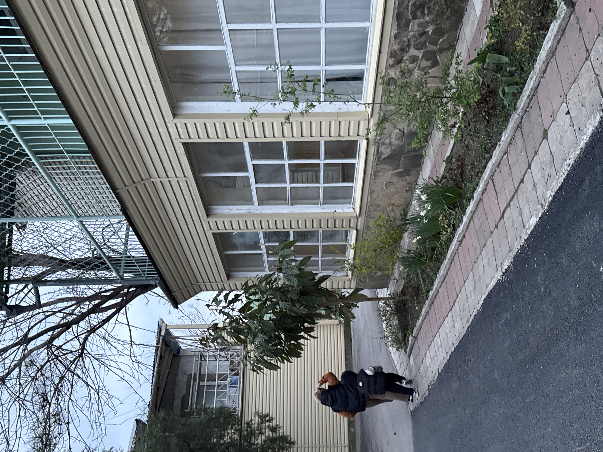 The image depicts a building exterior in Anapa, Russia. The building has cream-colored siding and multiple windows with white frames. A tree is planted adjacent to the building. A sidewalk with a brick border runs alongside the building. Two people are walking on the sidewalk; one person is wearing a black jacket and the other is wearing a tan jacket. Another building is visible in the background. Bare tree branches are visible in the sky.