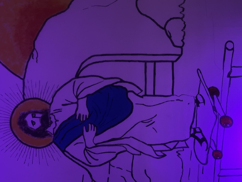 The image depicts a stylized drawing of Jesus Christ in a shroud, lying horizontally. He has a halo around his head with rays emanating outward. His face is drawn with simple lines. He is draped in a blue cloth. The background features a large rocky structure. There is an object in the top center resembling a table. In the right lower corner is another object, possibly a set of tools. The image is lit with a heavy purple hue.
