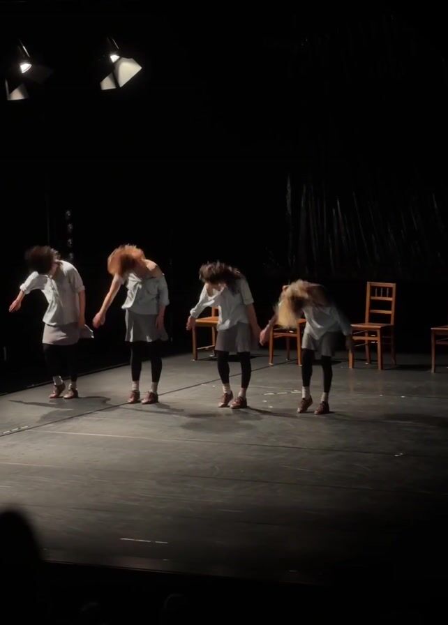 Four young women are performing a dance on a dark stage. They are dressed in matching outfits consisting of light-colored, loose-fitting tops, dark leggings, and skirts. They begin by placing their hands on their foreheads, then they twirl around, whipping their hair. There are four wooden chairs placed at the back of the stage. The stage is lit by a few spotlights. An audience is visible in the foreground but is largely obscured by darkness. The backdrop of the stage appears to be a dark curtain.