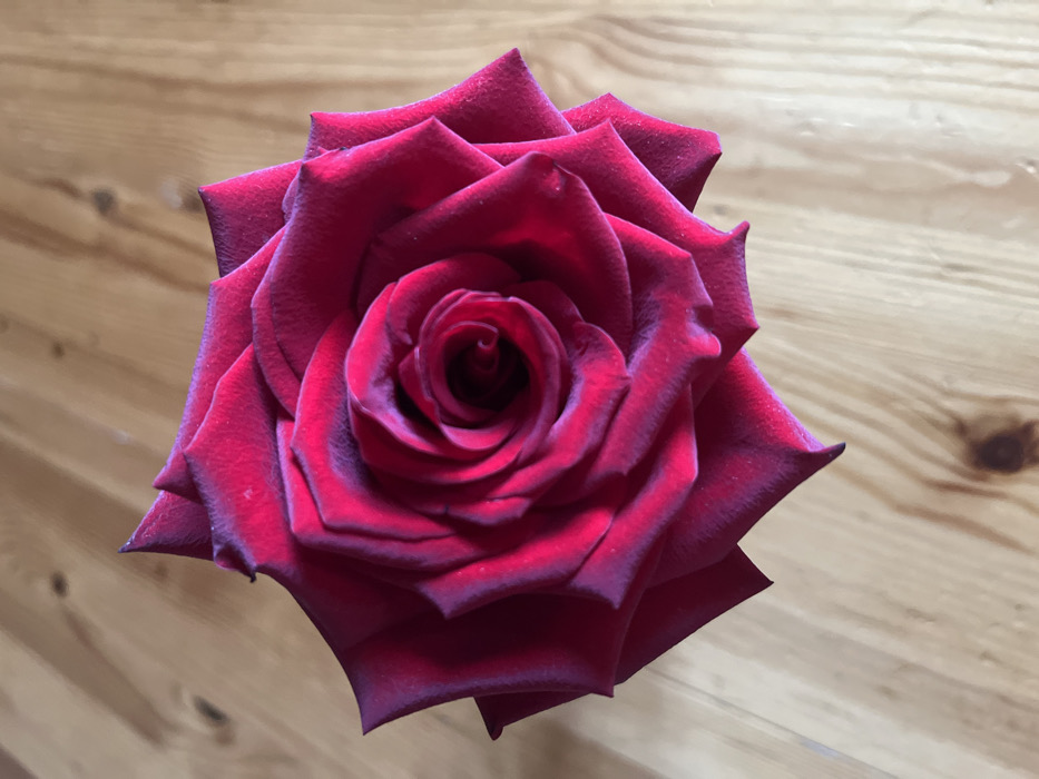 - "A single, fully bloomed deep crimson rose is centered on a light-colored wooden surface, depicted from an overhead perspective" by FM-WeWf32, licensed under CC BY 4.0