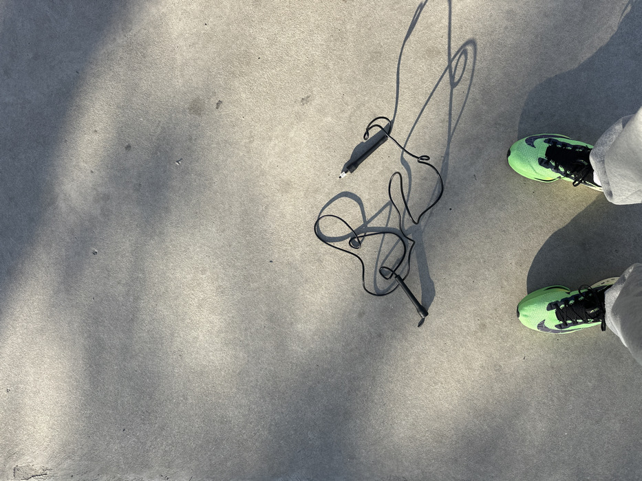 The scene captures an outdoor ground view from a first-person perspective in Plovdiv, Bulgaria. The surface is light gray, textured concrete or asphalt, illuminated by strong sunlight from the upper left, casting distinct shadows. In the lower portion of the frame, the subject's feet are visible, clad in light gray sweatpants and bright neon green athletic shoes with black laces and visible branding (Nike). Resting on the ground approximately 0.75 meters in front of the feet is a black electrical cable, approximately 1.5 meters in length, loosely coiled. One end of the cable features a male USB-A connector. The opposing end terminates in a cylindrical car charger or power adapter, featuring a pin-type tip. Both the cable and the shoes cast prominent, dark shadows across the ground.