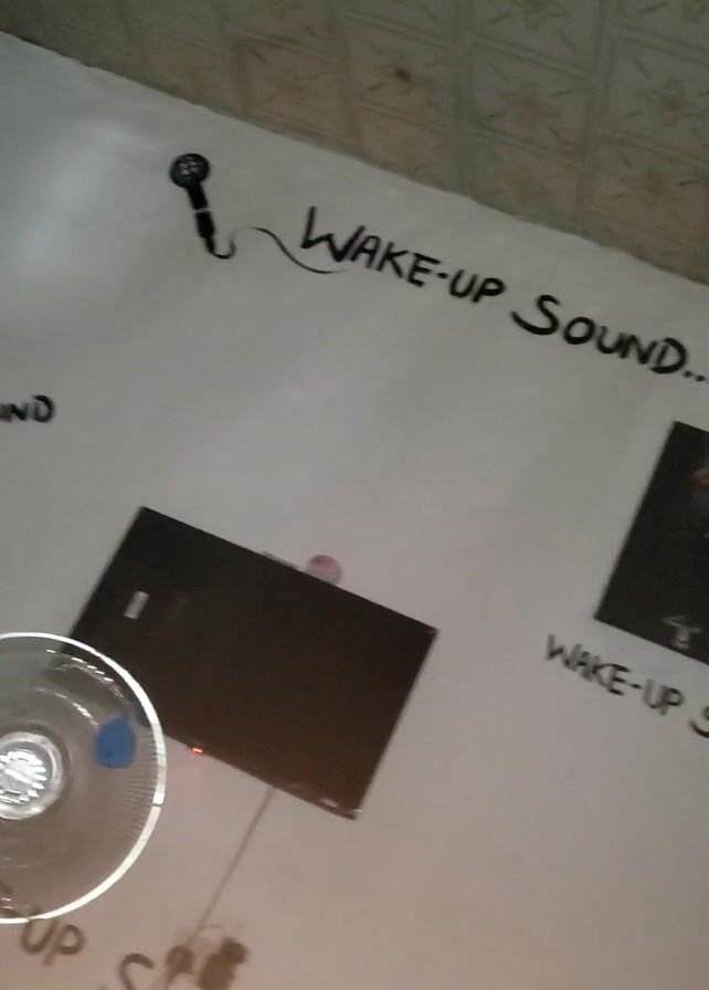 white wall with the words "WAKE-UP Sound..." written on it, along with images of a microphone, a photograph, and other black objects. A CD is visible in front of one of the black objects. The floor and ceiling have a patterned design. The camera moves slightly during the recording.