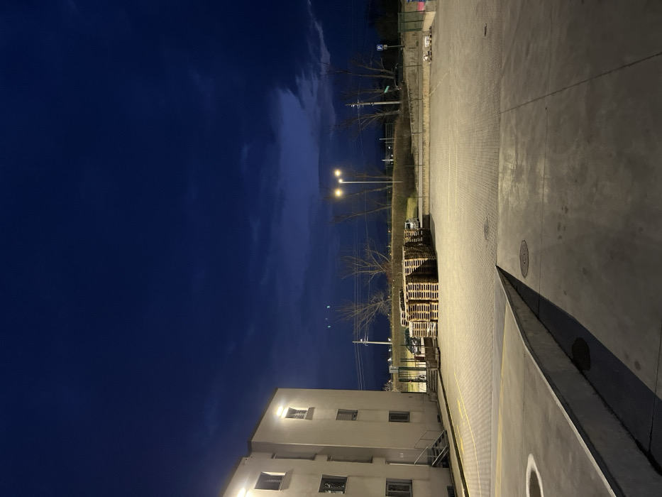 The image displays an outdoor industrial or commercial area at night in Bozhurishte, Bulgaria. In the foreground, a concrete loading dock or ramp structure extends from the lower-left, transitioning to a paved surface of interlocking pavers. Two circular manhole covers are visible on the concrete ground. To the left, a multi-story, light-colored building is illuminated by several external fixtures, highlighting its facade and multiple windows, some fitted with external blinds or shutters. A set of stairs with a handrail leads to a doorway on the building's lower level. Centrally located on the paved ground, a large, rectangular stack of numerous wooden pallets is present. Behind these pallets, a low concrete barrier precedes an elevated grassy berm with scattered leafless trees. A tall streetlamp with two bright yellow luminaires casts light across the central and right portions of the scene. Faintly visible vehicles are positioned behind a fence and the trees in the distance, alongside a blue parking sign on the far right. Overhead power lines run horizontally across the midground. The sky is a dark, deep blue, indicative of night or late twilight, with visible cloud formations. No individuals are present in the scene, and no actions or interactions are depicted.