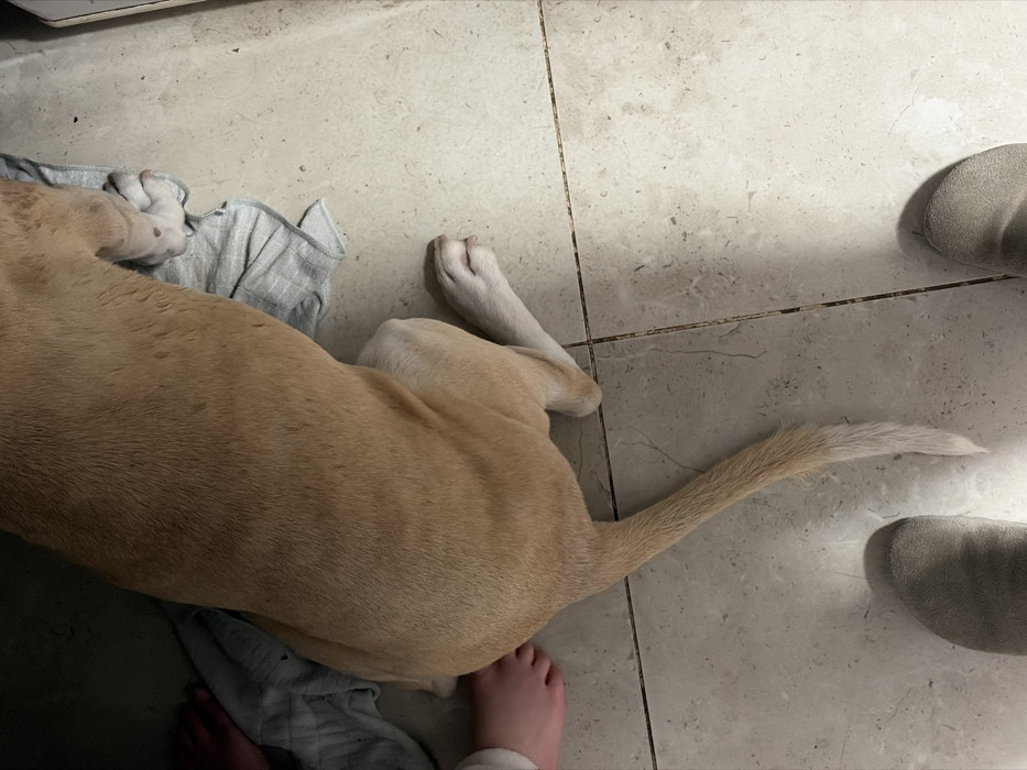 In Nirit, Israel, a top-down view captures a tan-furred dog lying on a light-colored tiled floor with dark grout. The dog's back, hindquarters, and tail are visible, with the tail transitioning from tan to a white tip. A light grey fabric item is partially visible beneath the dog's front section. To the left, a bare human foot with light skin tone is positioned near the dog's left flank. At the bottom-right, a human foot wearing a grey slipper is visible near the dog's tail. The tiled floor exhibits minor discoloration and wear. The scene is dimly lit.