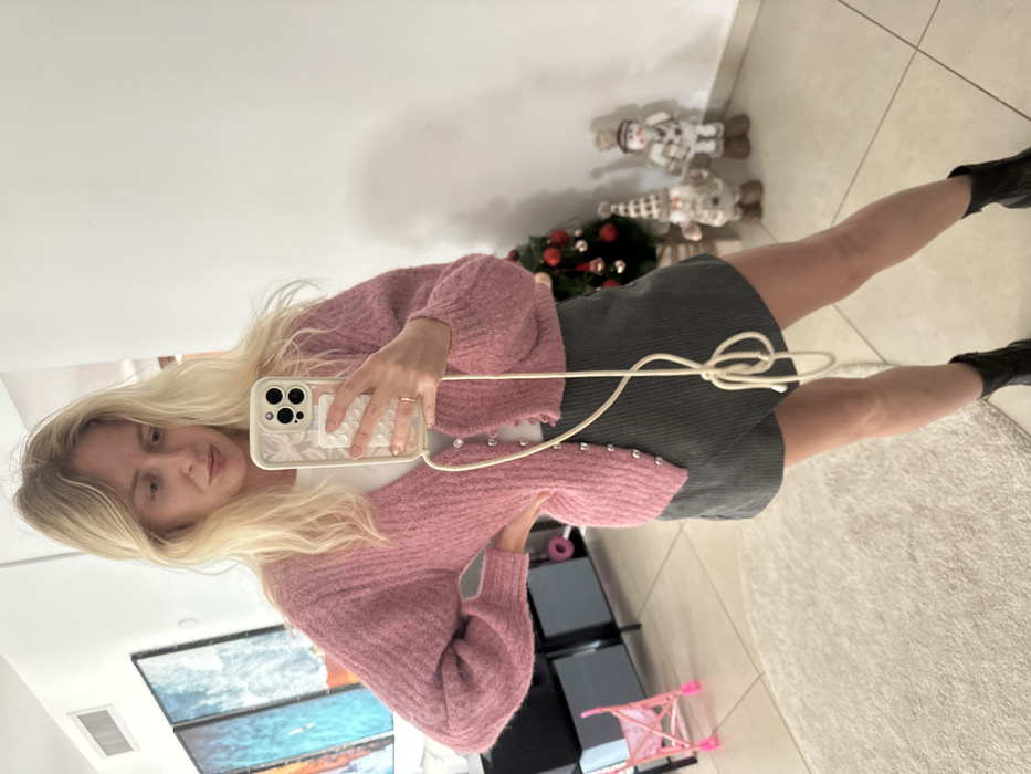 A fair-skinned individual with long, wavy blonde hair is captured in a mirror selfie indoors in Petah Tikva, Israel. The person wears a light pink, fuzzy V-neck cardigan partially unbuttoned over a white top, dark grey ribbed shorts, and black ankle boots. A simple ring is visible on the left ring finger. The individual holds a light-colored smartphone with a patterned transparent case and a white circular grip in their left hand, while a long, light-colored cord hangs from the phone. Their right hand is placed on their hip. The background features a white wall and a light-colored tiled floor, with a shaggy off-white rug partially visible. To the left, a dark, reflective piece of furniture is present, with two framed abstract artworks in blue, orange, and white tones above it, and a small pink doll stroller on the floor. To the right, a small Christmas tree decorated with red ornaments stands beside two festive gnome-like figures on the floor.