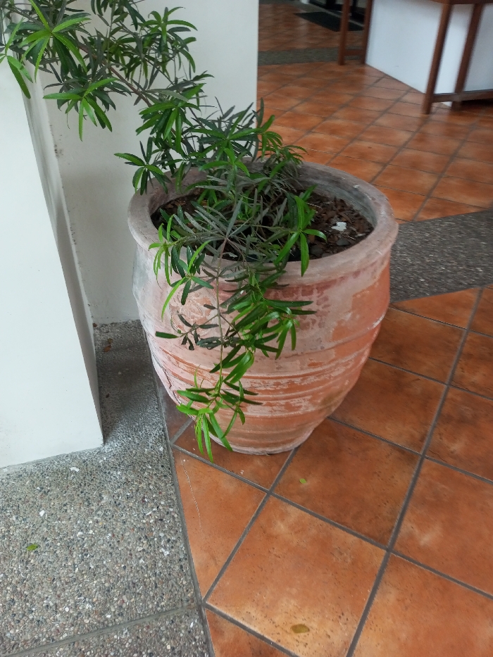 A terracotta pot houses a green plant with delicate, elongated leaves. The pot is textured with horizontal ridges and displays a weathered appearance. The plant's branches cascade outwards. The pot sits on a tiled floor with a combination of orange and grey squares. A white wall and a speckled grey surface are visible in the background. A table is partially visible.