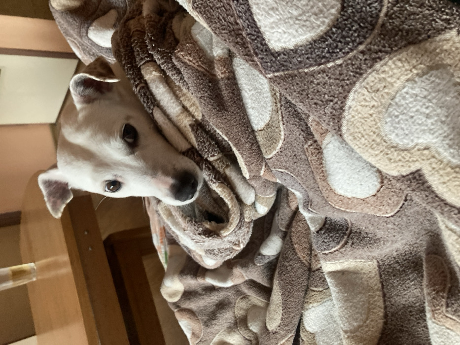 The scene is set indoors in Silistra, Bulgaria. A white dog with light brown markings inside its ears and a black nose is partially visible, emerging from a textured blanket patterned in shades of brown, beige, and off-white. The dog's dark eyes are directed forward. In the upper-left background, a wooden table holds a clear glass containing a light amber liquid. A light-colored wall and a portion of a door frame are also visible in the background. No people are present in the image.
