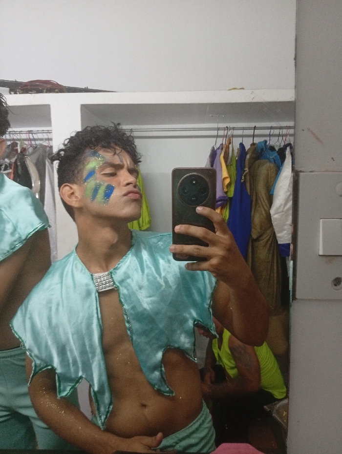 - "A man with curly hair, face paint, and a light blue, shiny costume takes a mirror selfie" by FM-xUvng2, licensed under CC BY 4.0