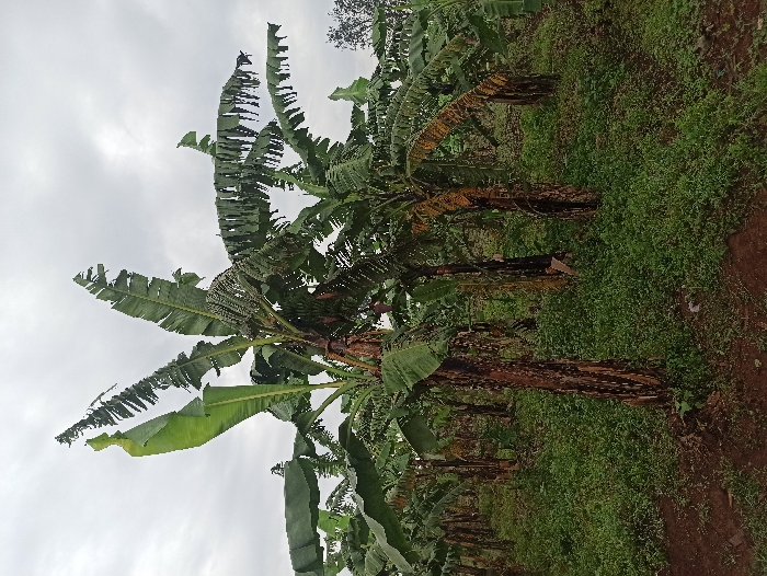 A banana plantation under an overcast sky. Rows of banana trees with distinctive patterned trunks and large, verdant leaves dominate the scene. Some leaves show signs of browning or damage. Low-lying green vegetation fills the ground between the trees. The soil appears reddish-brown, and the overall impression is of a rural, agricultural landscape.