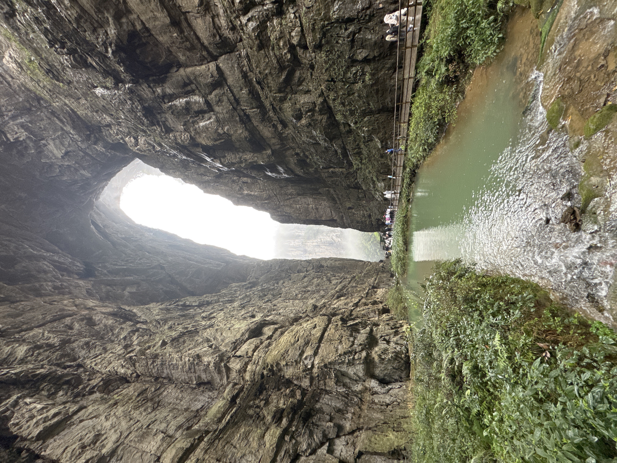 The image captures a deep, cavernous gorge in Wulong District, Chongqing, China. Two towering rock walls, heavily textured and damp, converge towards a bright opening at the top. A narrow river flows through the base of the gorge, its surface reflecting the sky. A wooden walkway hugs one side of the gorge, populated by a number of people walking. Green vegetation grows along the riverbank and onto the rock face. The overall atmosphere is one of dampness and depth.