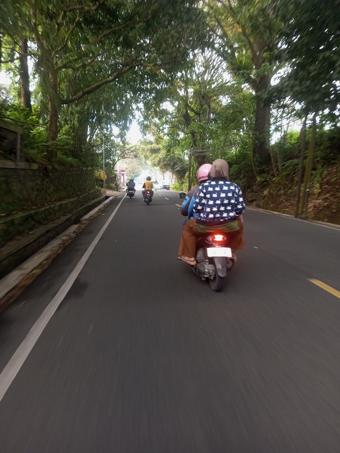 The image displays a two-lane asphalt road in San Pya, Myanmar, observed from a moving vehicle. The road surface features a solid white line on the left shoulder and a dashed yellow center line partially visible on the right. Three motorcycles are traveling away from the camera. The closest motorcycle, a dark scooter with an illuminated red tail light, carries two individuals. The driver wears a pink helmet and a blue top. The passenger, seated behind, wears a light brown head covering, a dark blue and white patterned long-sleeved shirt, and brown trousers, with visible sandals. Two additional motorcycles, each with a single rider, are visible further ahead in the lane. The first distant rider wears a yellow shirt, and the second a light blue helmet. To the left of the road, a stone retaining wall supports a dense growth of trees and foliage. To the right, a steep embankment is covered in thick green vegetation. Overarching trees create a canopy above the road. Distant buildings are faintly visible on the left side of the road further down.