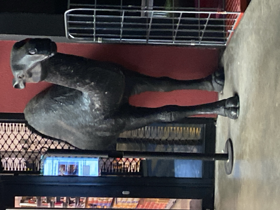 A dark-colored, possibly bronze, sculpture of an animal resembling a donkey or llama is angled toward the right