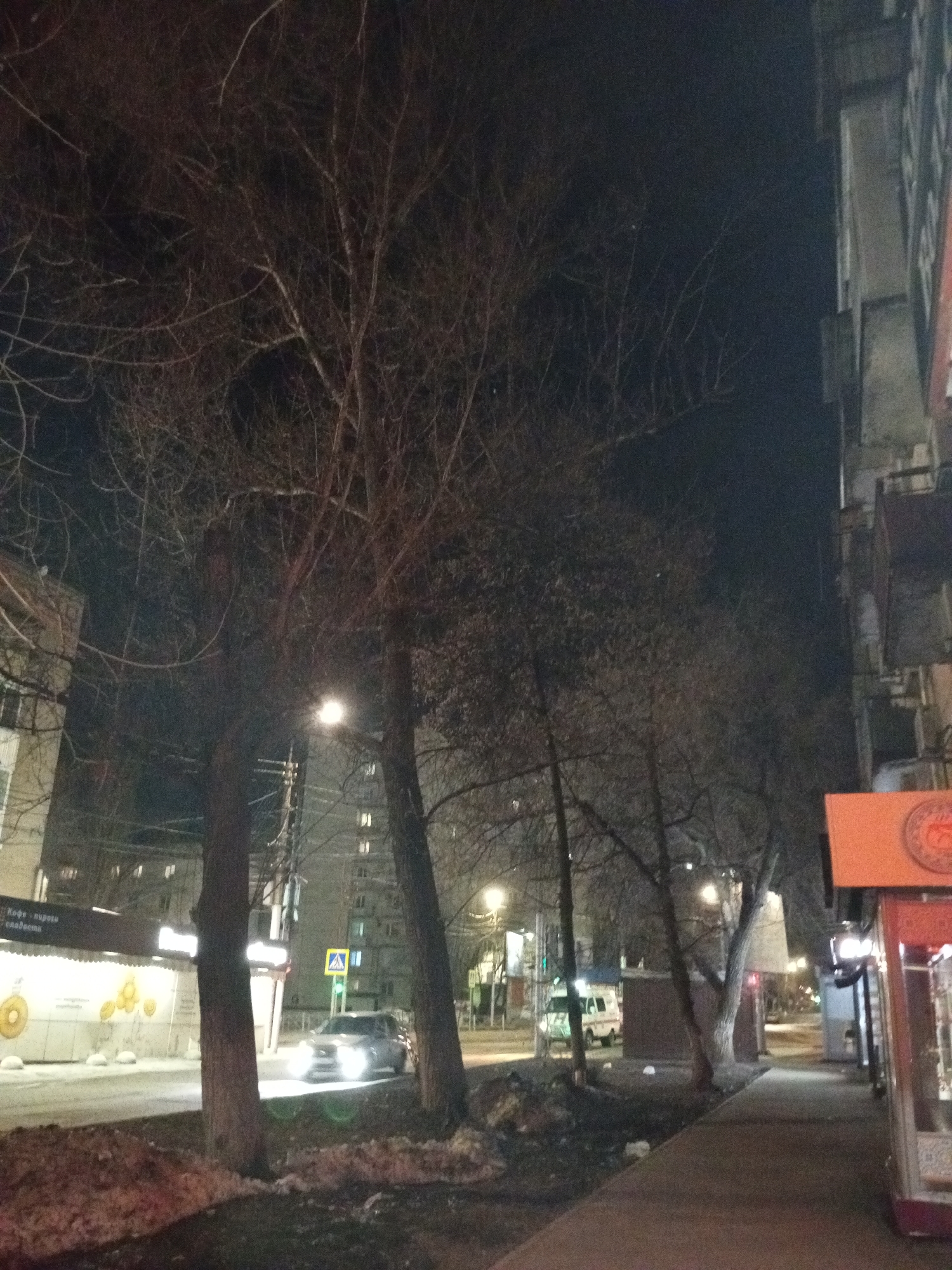 - "The image depicts an urban street scene at night in Saratov, Russia, during a cold season, evidenced by bare deciduous trees and remnants of dirty snow or slush on the ground" by FM-5jocF3, licensed under CC BY 4.0