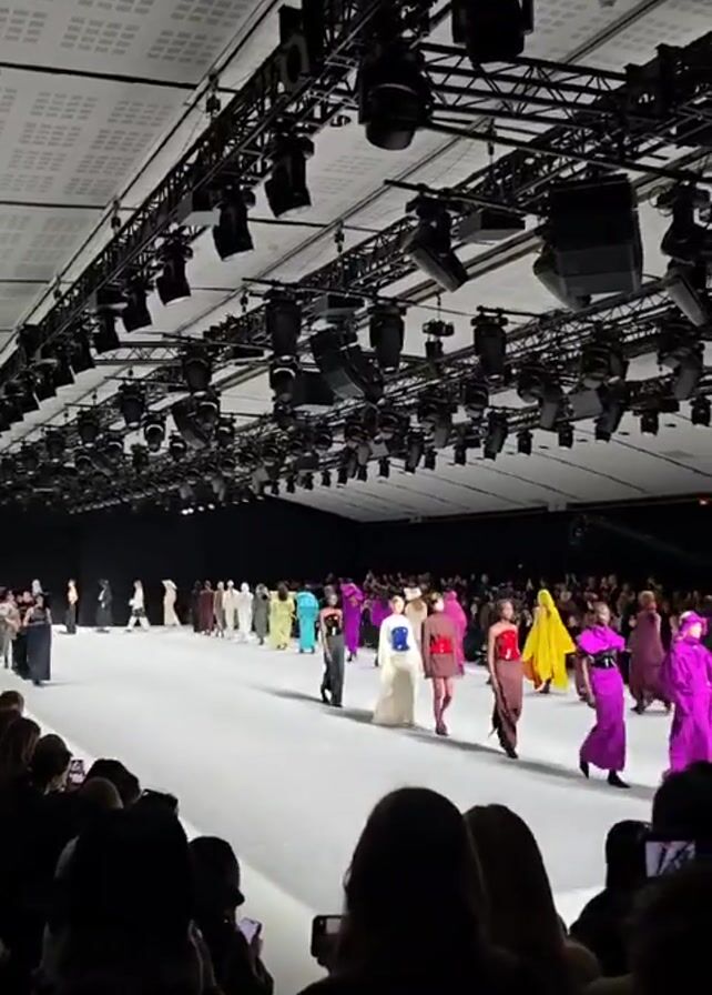 A fashion show is taking place. Models are walking down a white runway, showcasing various outfits in different colors including pink, white, and green. The audience is seated on both sides, with many people holding up their phones to record. Overhead, a complex grid of lighting and speakers spans the length of the runway. The room is large and well-lit, suggesting a professional fashion event.