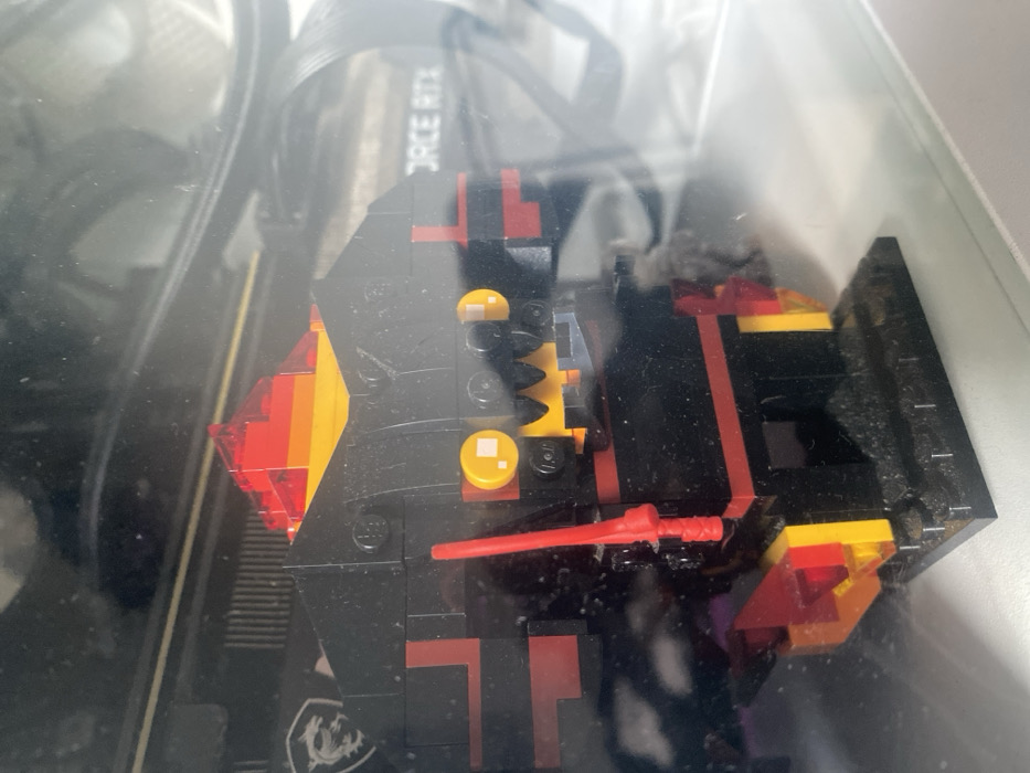 A close-up image taken in Toulouse, France, displays a custom-built LEGO figure situated inside a computer case. The LEGO construction is primarily black, accented with red and orange elements, and rests on a black baseplate. The figure exhibits two circular yellow "eyes" and a jagged "mouth" formed from black and yellow bricks. A single red LEGO sword accessory is vertically affixed to the left side of the figure's body. The top of the LEGO structure incorporates translucent red and orange components, suggesting a flame or energy effect. Behind the LEGO figure, a black graphics card is visible, featuring a white "MSI" dragon logo on its left and the partial text "FORCE RTX" on its right. Black internal cables are also present in the background. The scene is viewed through a transparent, dust-speckled, and slightly scratched panel, consistent with a computer's side window. Dust accumulation is observable on the LEGO model and various internal surfaces of the computer case.