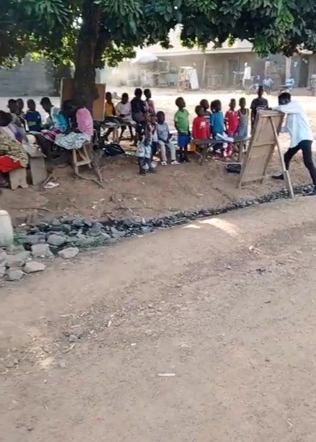 In an outdoor scene, a man stands before a group of children gathered under a large tree. The children are seated on stools and benches, facing the man who appears to be teaching or giving a lesson using a wooden board. The setting seems to be a rural area with a dirt path and a rudimentary drainage ditch separating the man and children from the viewer. The atmosphere suggests a classroom environment, though makeshift and outdoors.