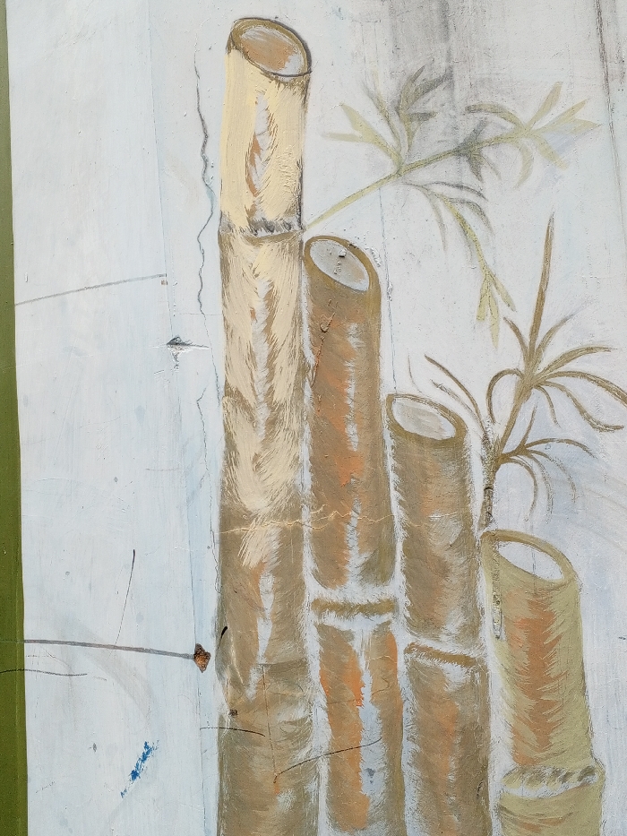 The image presents a close-up view of a painted mural on a light-colored wall in the city of Voa Yeav, Cambodia. The mural depicts several stylized bamboo stalks of varying heights and widths, rendered in shades of beige, cream, and light brown. Each stalk features a diagonally cut top, revealing a lighter, hollow-appearing interior. Sparse, thin leaf-like elements in pale green and beige are painted behind and between some of the stalks, predominantly on the right side. The background of the mural is a muted blue-grey or off-white. The underlying wall surface exhibits multiple vertical and horizontal cracks, minor surface imperfections, and several dark, thin drip marks or stains. A solid vertical strip of dark olive green paint is visible along the extreme left edge of the frame, indicating an adjacent architectural feature or painted border. A small, irregular blue paint smudge is also present on the lower left portion of the wall.