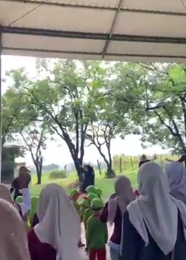 Under a large covered area with a metal roof, a group of adults, many wearing headscarves, stand facing several people, some of whom appear to be leading activities. Several children in bright green tops and caps are also part of the group. The setting seems to be outdoors, adjacent to a field of green trees, with some individuals standing in the distance. The leaders are standing and gesturing. The group appears to be engaged in some kind of organized event or activity, possibly involving exercise or dance movements.
