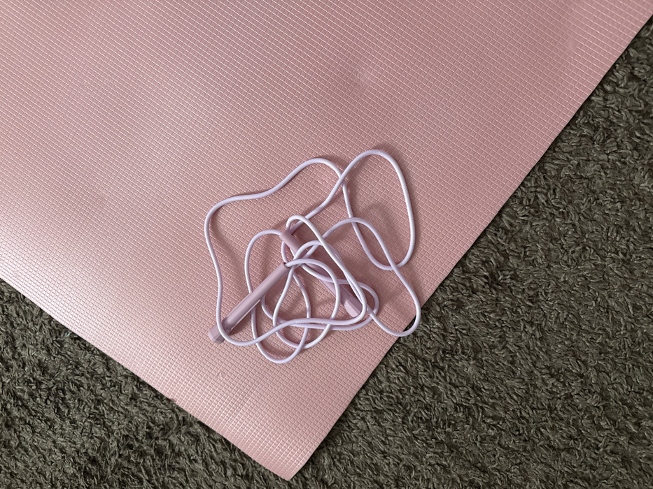 In a room located in the city of Sirius, Russia, a light pink exercise mat with a grid texture lies diagonally across a dark brown shag carpet. A white jump rope with two light pink plastic handles is coiled loosely on the exercise mat. No individuals are present, and no actions are occurring.