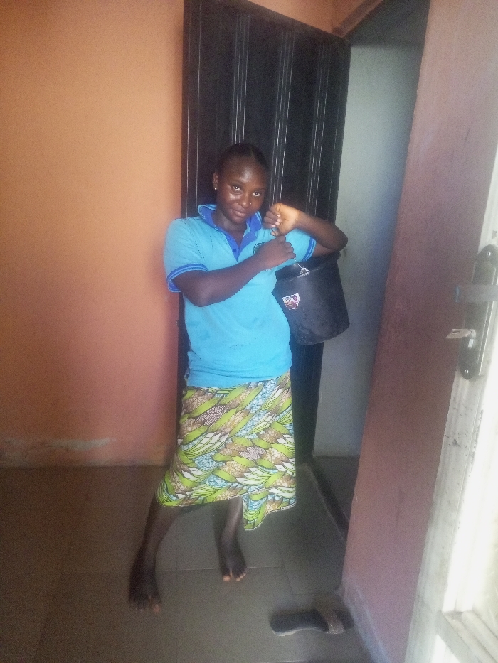 An individual stands in a sheltered doorway, in what is stated as Akwanga, Nigeria. The dark-skinned female, appearing to be a young adult, faces the camera with a slight smile. She is dressed in a light blue short-sleeved polo shirt featuring a dark blue collar and sleeve trim, and a patterned skirt displaying green, brown, and light blue abstract designs. Her hair is pulled back, and she is barefoot. She carries a black plastic bucket on her left shoulder, supporting it with her left hand. A white label with red text is visible on the bucket's side. A single dark-colored flip-flop rests on the tiled floor to the right of her feet. The immediate environment includes an orange-brown painted wall to her left, a dark, multi-paneled door directly behind her, and a partially visible lighter brown door frame with a silver handle mechanism to her right. The floor is composed of dark gray or brown tiles.