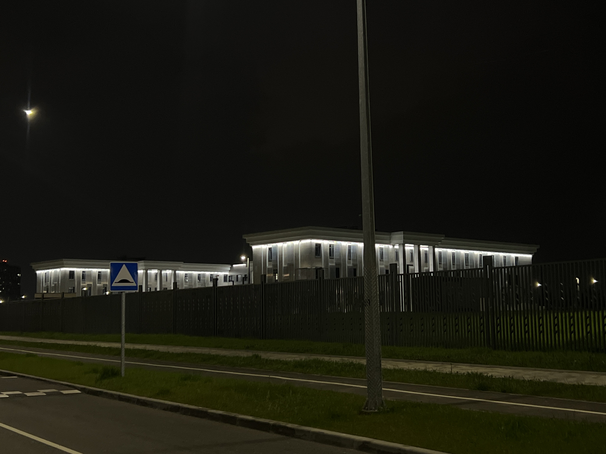 The scene depicts an exterior nighttime view of an urban environment in Krasnodar, Russia, specifically structures associated with the Academy of FC Krasnodar, located at Vostochno-Kruglikovskaya Ulitsa, 4A. In the foreground, a multi-lane asphalt road with white lane markings runs horizontally across the bottom of the frame, bordered by a concrete curb. Adjacent to the curb is a strip of green grass, forming a median. Further back, a paved pathway, likely for pedestrians or cyclists, runs parallel to the road. A blue square traffic sign, featuring a white triangle indicating a speed bump or rough road, is mounted on a grey pole within the grassy median, positioned to the left of the frame's center. In the mid-ground, a tall, dark-grey utility pole stands vertically on the right side, extending beyond the top edge of the image. Behind the pathway and median, a tall, dark-colored security fence with vertical slats extends horizontally across the entire width of the frame, obscuring the ground level of the structures behind it. In the background, two modern, multi-story buildings with light-colored facades are brightly illuminated against a dark, cloudless night sky. The larger building on the right features numerous evenly spaced vertical window sections and prominent perimeter lighting along its roofline and architectural details. A smaller, similarly constructed and illuminated building is partially visible to the left. Distant point light sources, including a bright street light in the far upper left, are scattered across the dark background. The scene is devoid of any visible human presence or vehicular traffic.