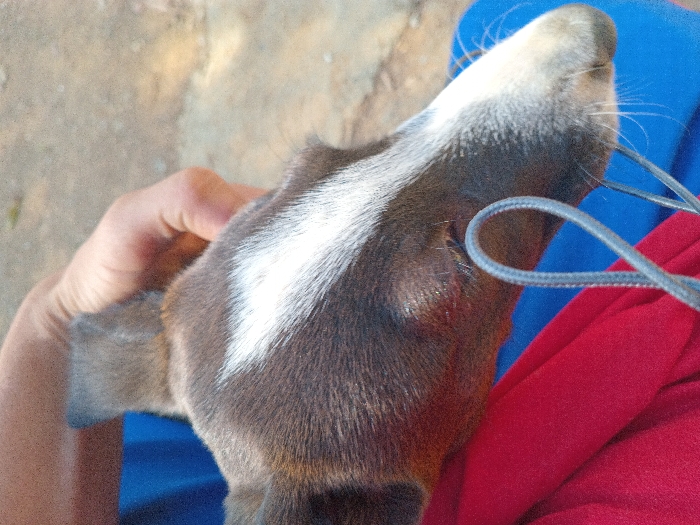 In the city of Cujisal, Venezuela, a close-up, left-side profile view of a dog's head is depicted. The dog exhibits brown fur with a prominent white blaze extending down its forehead and muzzle. Its left ear is upright. A reddish, possibly swollen area or lesion is visible on its left cheekbone, inferior to the eye. A light-skinned human hand is positioned behind the dog's head, appearing to gently support or hold it. A looped gray braided cord or leash is present in the lower foreground. The dog rests against red fabric, which is layered over blue fabric. The background is an out-of-focus, light-colored granular surface, consistent with dirt or gravel in an outdoor setting under natural daylight.