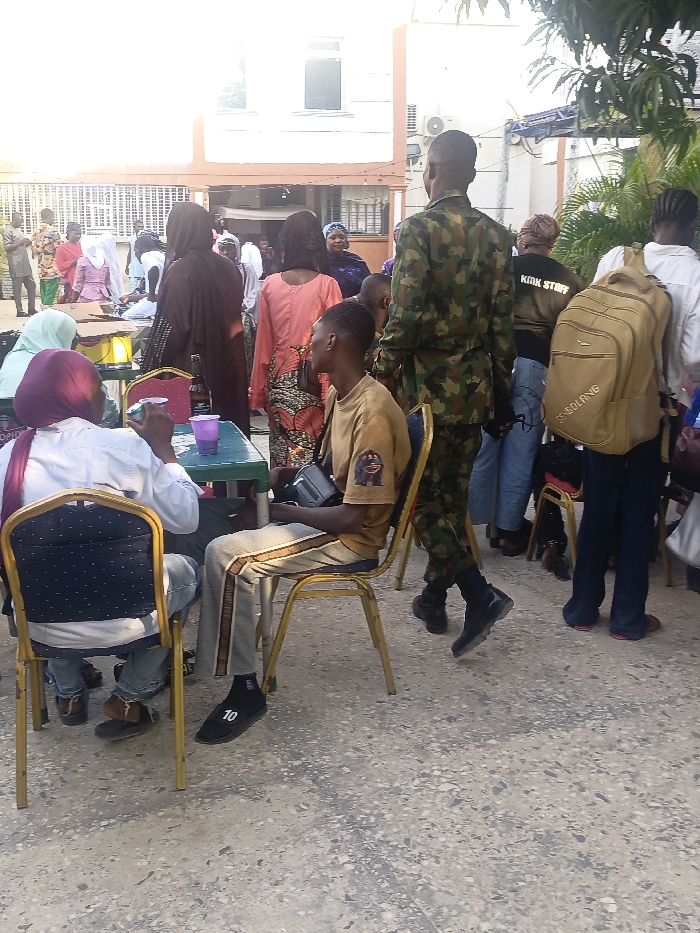 The image portrays an outdoor gathering in the city of Lafia, Nigeria, taking place on a light-colored paved surface under bright daylight