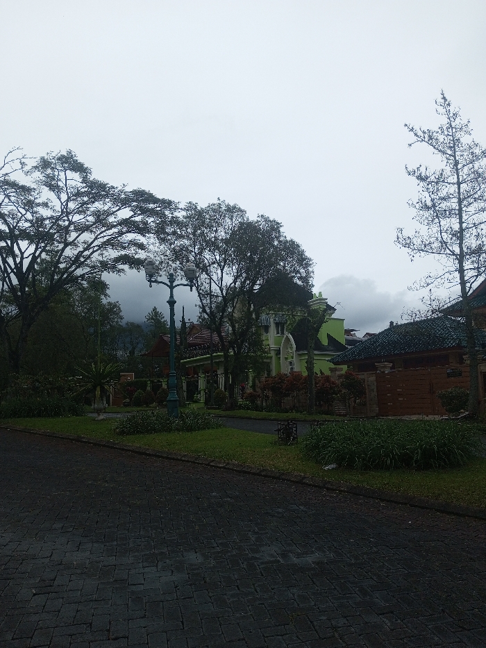 The image depicts an outdoor scene in Babaliya Mal., India, under an uniformly overcast sky. In the foreground, a dark gray interlocking paver road or path curves towards the right, bordered by manicured green grass and low shrubs. A prominent, dark-colored, ornate street lamp with two unlit globes stands in the midground, slightly left of center. To the left and behind the street lamp, numerous mature trees with dense, dark green foliage are visible, silhouetted against the sky, with distant mountains partially obscured by clouds. To the right of the street lamp, a distinct light-green building featuring white architectural trim, arched windows, and pointed roof sections is visible. Adjacent to it on the right are other structures, including one with a reddish-brown tiled roof and another with a dark green tiled roof fronted by a brown wooden fence. No individuals are present, and no explicit actions or interactions are depicted. The environment is a well-maintained, landscaped residential or resort area observed during overcast daylight conditions.