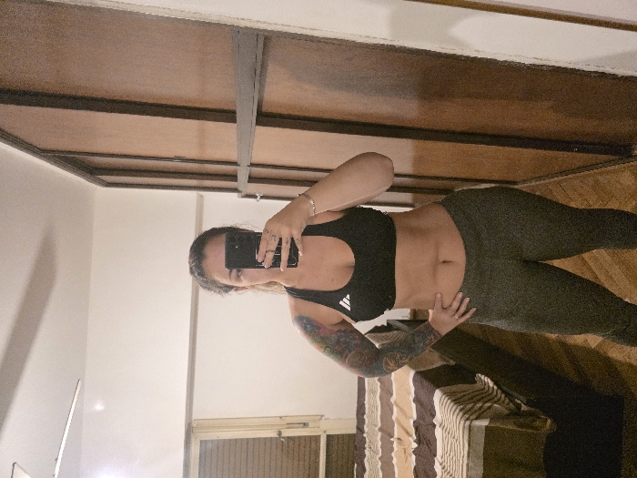 A woman is pictured in a mirror selfie. She wears a black sports bra and gray leggings, revealing her midriff. Her left arm features a colorful tattoo sleeve. She holds a phone in her right hand, partially obscuring her face. The background shows a room with a bed, wood flooring, and a white wall. The mirror's frame is visible at the top, revealing wooden beams.
