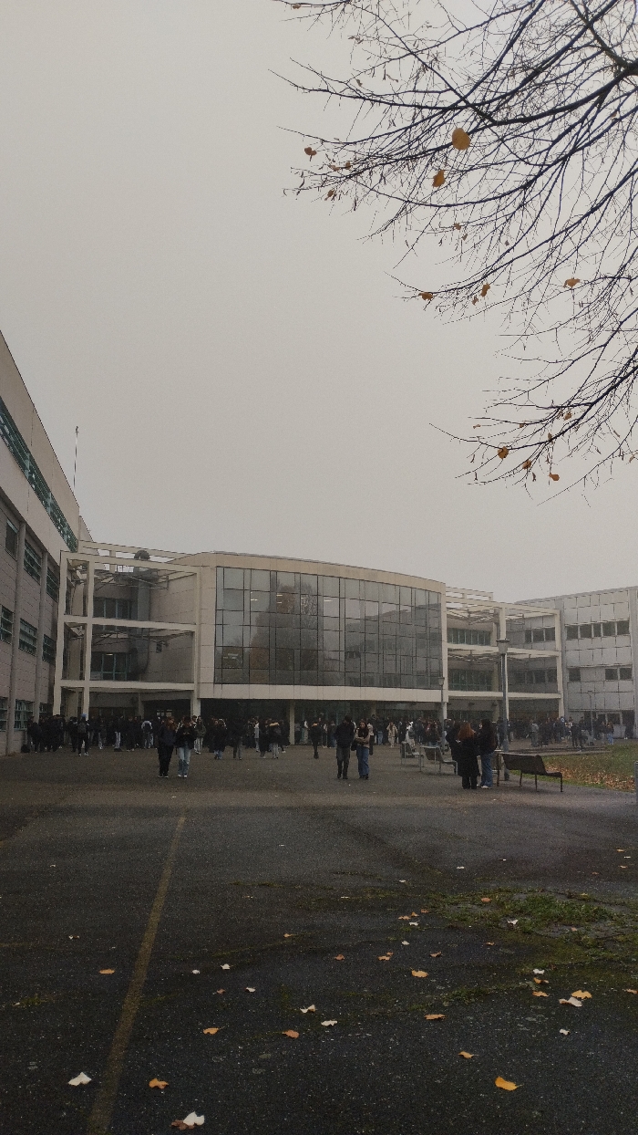 The image displays an exterior view of a large educational facility located in Bischheim, France, under an overcast sky. The foreground consists of a dark asphalt surface, marked by a faded yellow line on the left, and is scattered with numerous yellow and brown autumn leaves. Patches of moss or short grass are also visible on the asphalt. In the mid-ground, a crowd of approximately 70 to 100 individuals, consistent with a student population, is gathered across the paved area in front of a multi-story building. Individuals are observed standing, walking, and congregating in small groups, dressed predominantly in casual outerwear such as dark jackets and coats. Several dark-colored benches are present on the right side of the paved area, with some individuals positioned near them. The background is dominated by a modern building featuring a prominent, curved glass facade in its central section, which reflects portions of the overcast sky and bare trees. The building exhibits multiple stories with white and grey wall sections and visible structural elements. A distinct wing of the building extends to the left, characterized by numerous rectangular windows. The upper right portion of the frame is occupied by the dark, bare branches of a deciduous tree, from which a few remaining yellow leaves are suspended. The overall illumination is soft and diffuse, indicative of an overcast day during late autumn or early winter.
