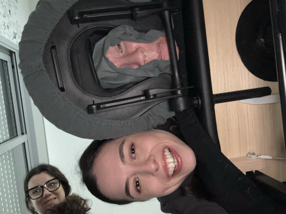The image captures three individuals in an indoor setting in Bat Yam, Israel, viewed from a low angle looking upwards. In the lower-left, a young adult female with dark hair smiles broadly towards the camera, her face and part of her upper torso visible. In the upper-left, another young adult female with dark, curly hair and clear-framed glasses is partially visible, also looking towards the camera. To the right, the face of a third individual is seen through the central opening of a dark grey, padded headrest, likely part of a massage table. This individual's face is partially covered by a draped green fabric, revealing a silver nose ring on the right nostril and open eyes looking towards the camera. Below the headrest, a light wooden surface and black structural components are visible, with a white earbud resting on the wooden surface. The background features a light-colored wall and a white ceiling with a rectangular, louvered light fixture.