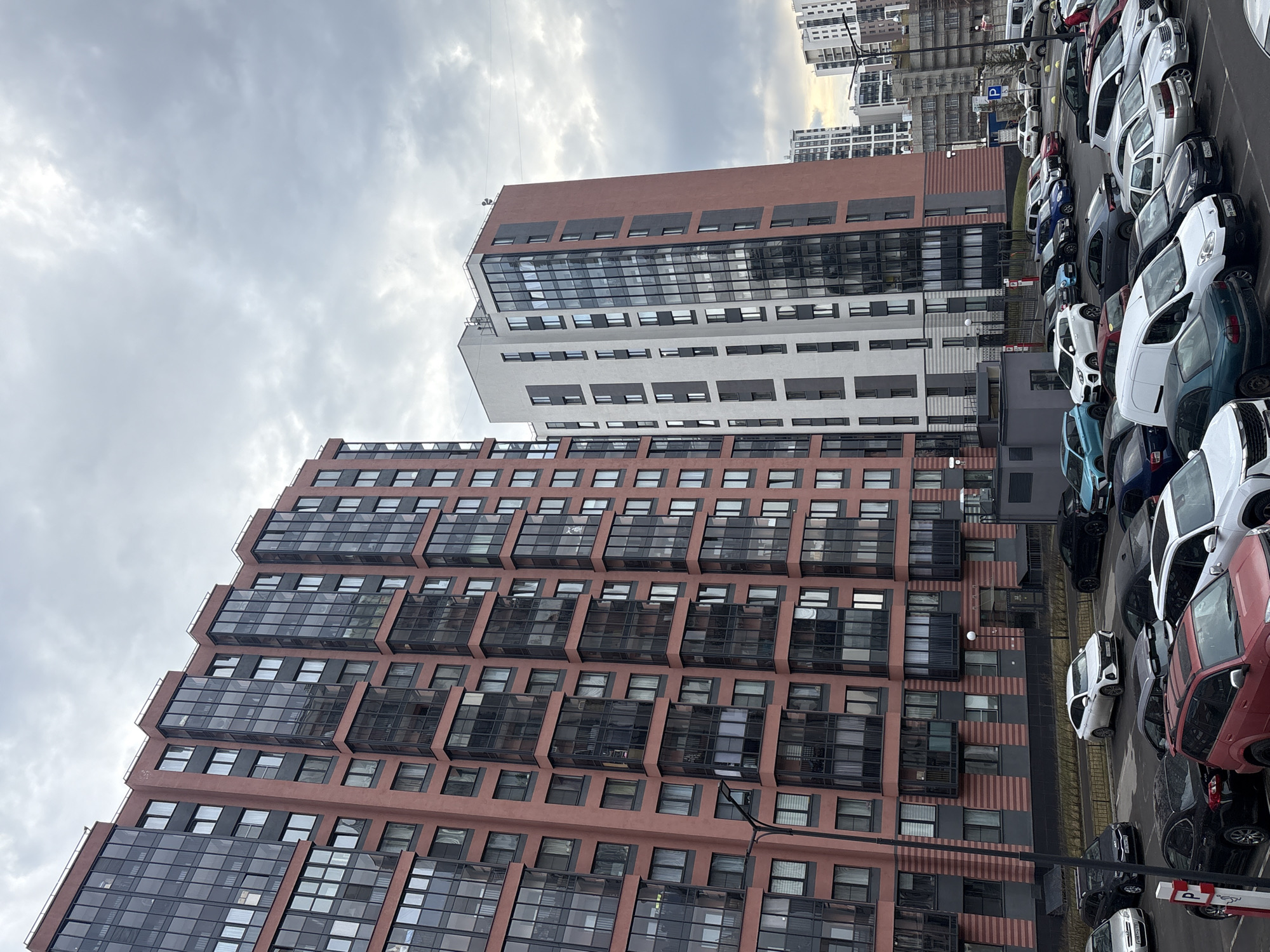 cityscape with buildings and a parking lot in Saint Petersburg, Russia. Two prominent, modern apartment buildings dominate the scene, constructed with a reddish-brown and white brick facade. A parking lot is visible on the right side of the image, packed with various cars of different colors and models. The sky is overcast with grey clouds. Other buildings are visible in the distance.