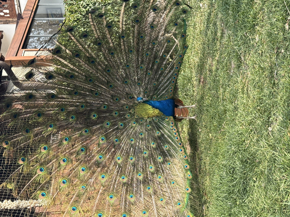 - "A male Indian peafowl (Pavo cristatus) stands on short green grass, displaying its fully fanned tail feathers" by FM-EnvuH2, licensed under CC BY 4.0