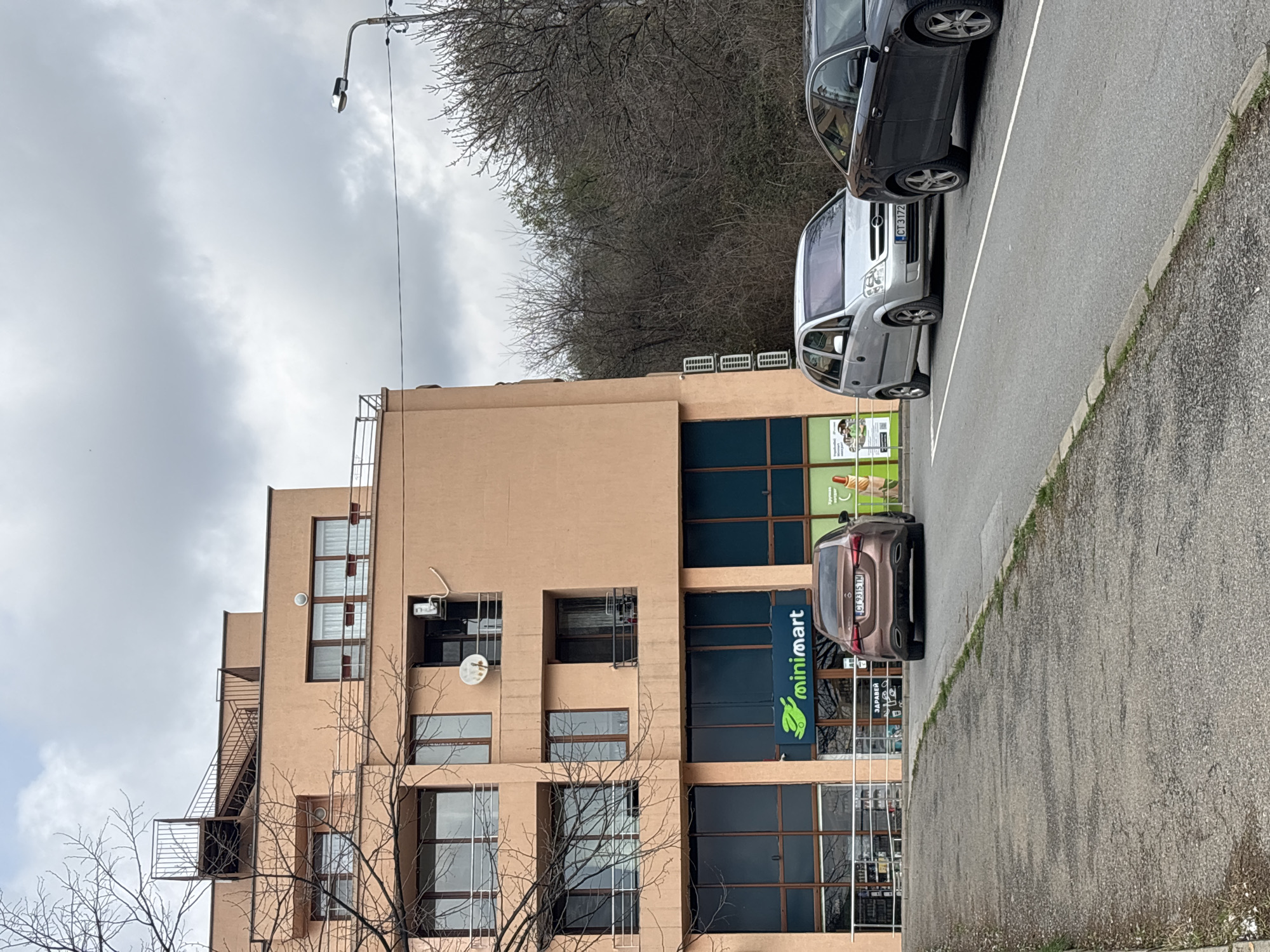 The image depicts a Minimart located in Stara Zagora, Bulgaria. The building is a multi-story structure with a beige facade and dark-framed windows. A "Minimart" sign with a green logo is visible near the entrance. Three vehicles are parked along the curb in front of the building: a dark sedan, a silver van with license plate "CT 3172", and a brown hatchback car. The sky is overcast. A street lamp is visible on the left side of the building. Trees with bare branches are in the foreground and on the hill behind the building. A metal fire escape is attached to the side of the building. The sidewalk and street show signs of wear and discoloration.