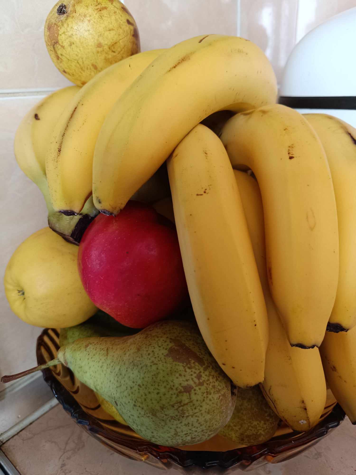 A fruit bowl filled with various fruits is on a counter. The fruit includes a bunch of yellow bananas, a red apple, a yellow apple, a green pear, and a yellow fruit with brown spots. The bowl is brown and gold. The counter appears to be in a kitchen with beige tiles on the wall behind the fruit bowl. There is a white object partially visible in the background. The location is Shumen, Bulgaria (based on request).