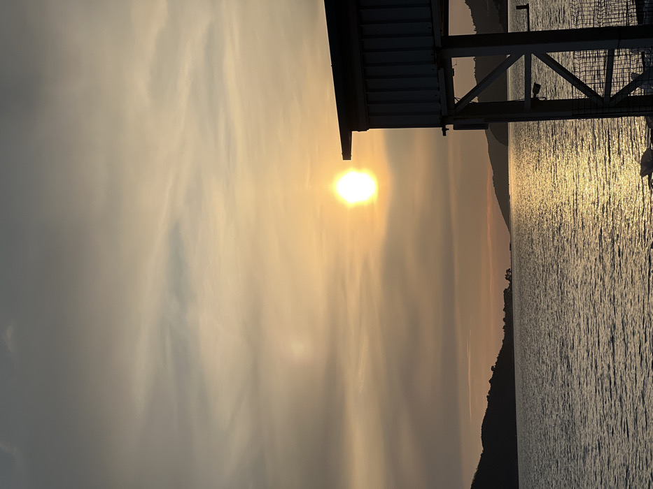 The image captures a sunset scene over a body of water in Kamenovo, Montenegro. The sun, a bright, intense orb, is positioned in the upper right section of the frame, casting a distinct golden reflection that shimmers across the water towards the viewer. The sky exhibits varying shades of orange, yellow, and grey, with scattered clouds partially obscuring the upper atmosphere. A fainter, secondary halo of light is visible to the left of the primary sun. Along the horizon, dark silhouettes of multiple distant hills and landmasses define the coastline, suggesting a bay or strait. In the foreground, on the right side, a portion of a man-made structure is visible. It is light-colored, constructed with vertical panels, and features a dark roofline and visible support beams with what appears to be a caged lower section, consistent with a waterside utility building or boathouse. No individuals are present in the scene.