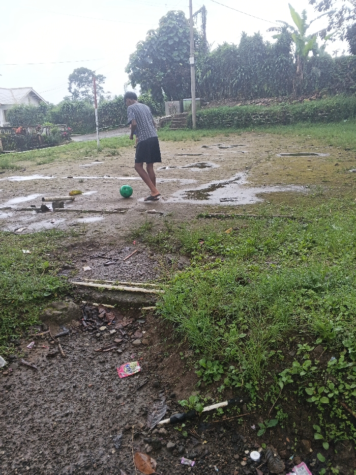 A young person in a patterned shirt and shorts plays with a green ball in a muddy, wet field. The ground is uneven and puddled. Vegetation grows sparsely. There is trash and debris visible in the foreground. In the background, a house, trees, and bushes are visible on a cloudy day.