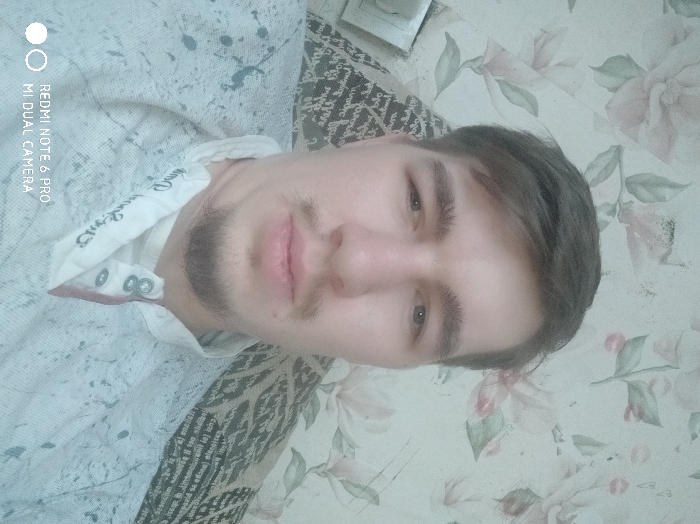 An indoor portrait photograph captures a Caucasian male, approximately 20-30 years of age, situated in Chaikovsky, Russia. The male features short, dark brown hair, prominent eyebrows, a short mustache, and a goatee, maintaining a direct gaze at the camera with a neutral expression. He is attired in a light-colored, possibly light gray or white, long-sleeved Henley-style shirt with a speckled pattern, worn over a white collared undershirt displaying embroidered text. The background consists of a wall covered in floral wallpaper, presenting a pattern of light-colored flowers and green leaves on a pale ground, with minor areas of discoloration. To the subject's right (viewer's left), a segment of a dark, patterned cushion or upholstery is visible. Behind his left shoulder (viewer's right), a light-colored rectangular electrical plate is affixed to the wall. The image bears a "REDMI NOTE 6 PRO MI DUAL CAMERA" watermark at the bottom left.