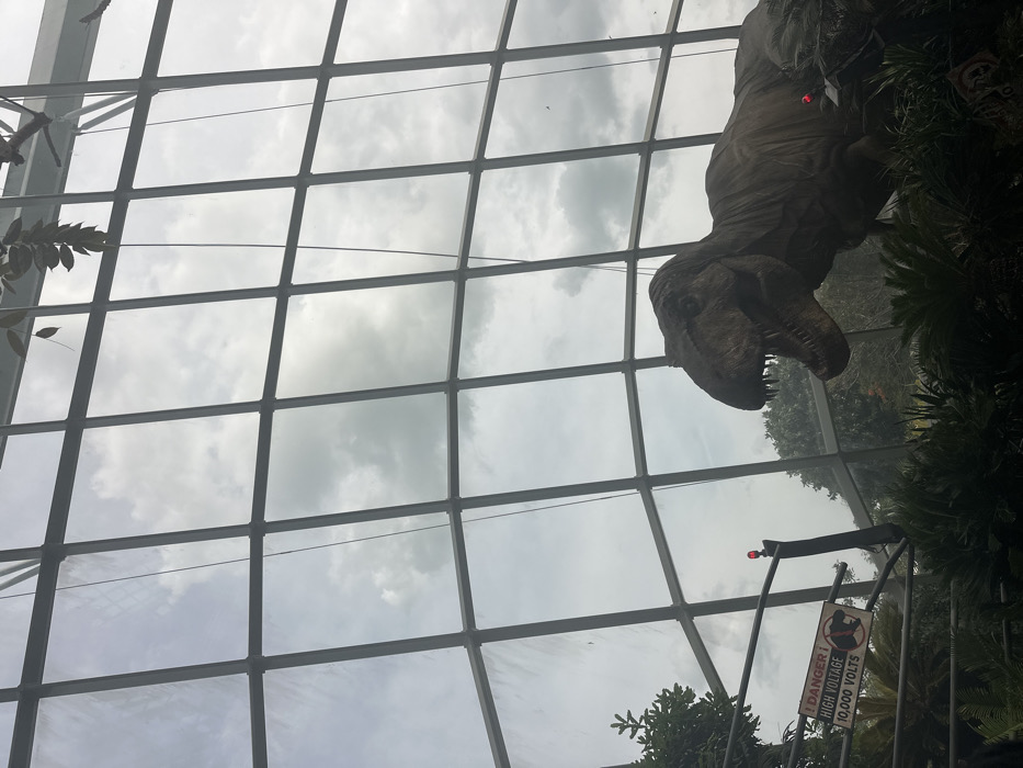 - "The image displays a static, realistic animatronic model of a Tyrannosaurus Rex situated within a large, glass-domed conservatory, specifically a themed exhibit at Gardens by the Bay in Singapore" by FM-S4vcm1, licensed under CC BY 4.0