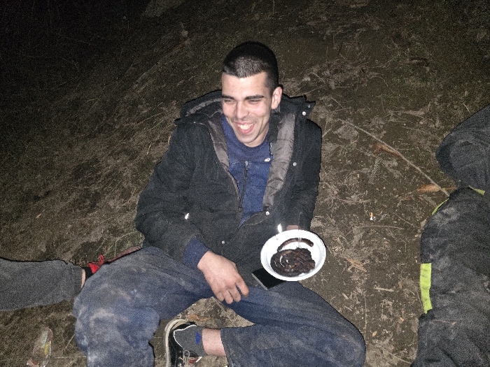 An outdoor, nighttime scene in Cherven Bryag, Bulgaria, depicts two individuals seated on dark, uneven ground. The primary subject, a male, is centrally positioned, wearing a dark jacket over a blue hoodie, blue jeans, and black sneakers. He has short dark hair and a wide, open-mouthed smile, indicating laughter. In his left hand, he holds a white paper plate containing multiple dark, coiled, cylindrical objects. A black smartphone rests on his lap, held by his right hand. To the right, a second individual is partially visible, wearing a dark hooded jacket with a neon green vertical stripe and dark pants, also seated on the ground. Between the two, a cigarette butt is visible on the dirt. The ground is dark, appearing as disturbed soil with scattered organic debris. The scene is illuminated by an artificial light source, casting light directly on the subjects and the immediate ground, while the background remains dark.