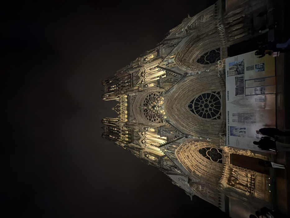 A nighttime view showcases a cathedral's ornate facade, illuminated against a dark sky. The architectural details, including the rose windows and intricate stonework, are highlighted by the lighting. To the side, a display board with images and text is visible, along with a few people standing nearby. The image's perspective is tilted, capturing the height and grandeur of the cathedral.