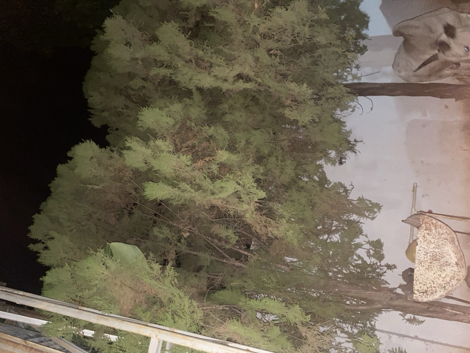 A dense evergreen tree with intricate foliage fills the frame, contrasting against a dark background on the left. The tree's branches reach towards a light-colored building on the right. A stone ornament and metal railing are visible, indicating the scene is likely a garden or yard at night. The composition is dominated by the tree's texture and the juxtaposition of natural and artificial elements.