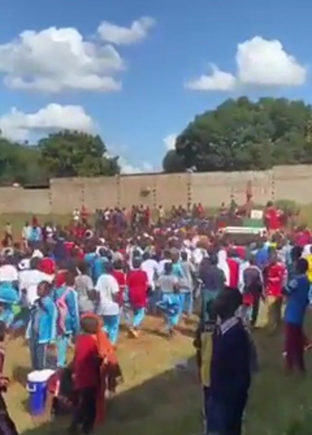 large crowd of people, mostly children, gathered in a field under a blue sky with scattered clouds. They are dressed in various colors, including red, white, and light blue school uniforms, and other casual clothing. The children are standing, moving around, and appear to be celebrating or participating in an event. There is a small vehicle in the middle of the crowd with someone standing on top of it. A low brick wall surrounds the field, with trees visible behind it. Some people are seated on the ground in the foreground, watching the activity. The camera moves slightly, providing different views of the crowd and the surrounding environment.