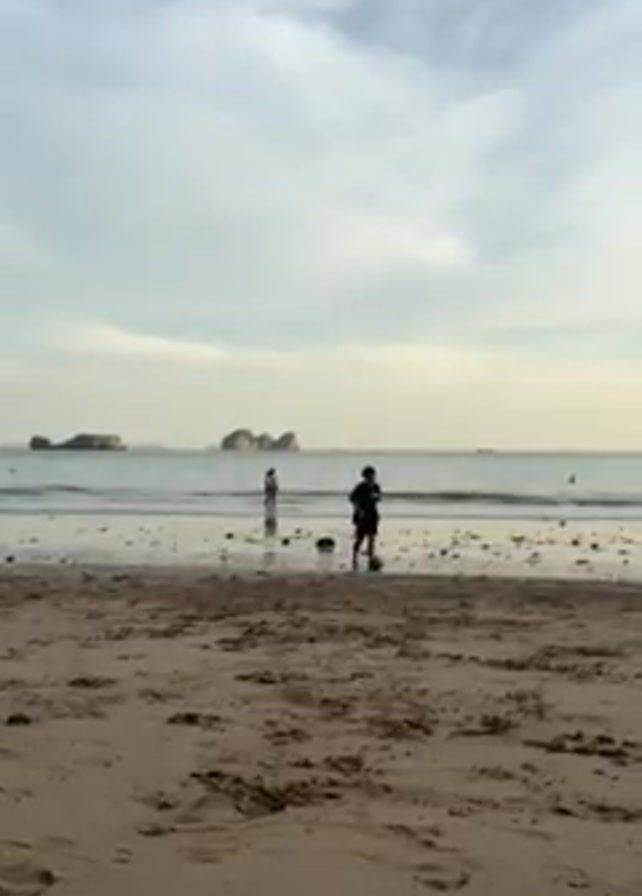 The scene captures a low-angle, static shot of a sandy beach leading to the ocean under a cloudy sky. A lone person, appearing as a silhouette, dribbles a soccer ball towards the camera along the wet sand. In the background, several other people are visible, some standing in the shallow water. Two rocky islands can be seen on the horizon. The sand shows footprints and darker patches where it is wet.