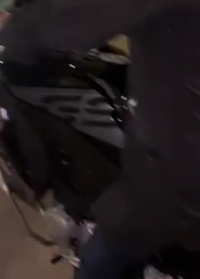 A person in a dark jacket sits astride a black and gray motorcycle, apparently in a garage or parking area. The motorcycle's instrument panel is lit, and the engine is running. The camera is unsteady, suggesting it is handheld. The lighting is dim, but adequate to discern the motorcycle and the person.